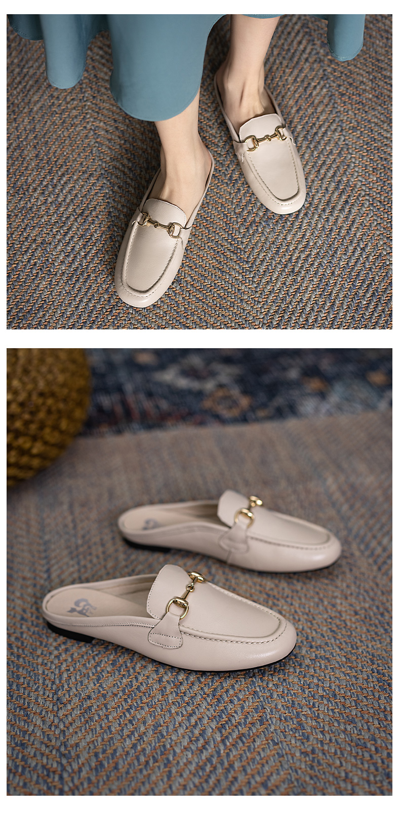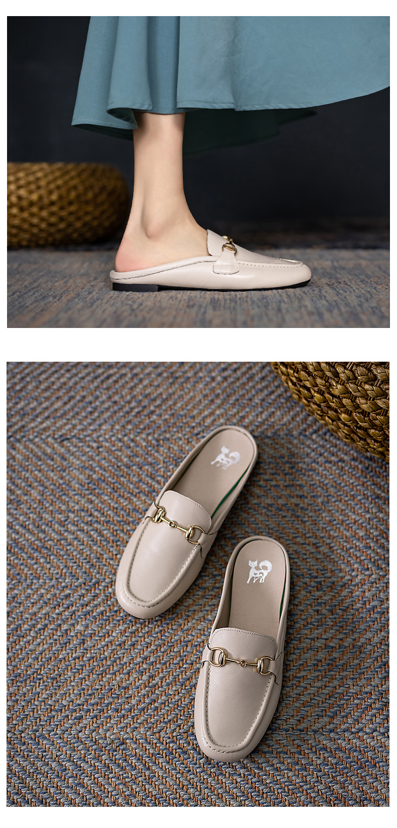 浪莎包頭拖鞋女夏外穿2021春真皮平底半拖鞋粗跟圓頭搭扣穆勒涼拖